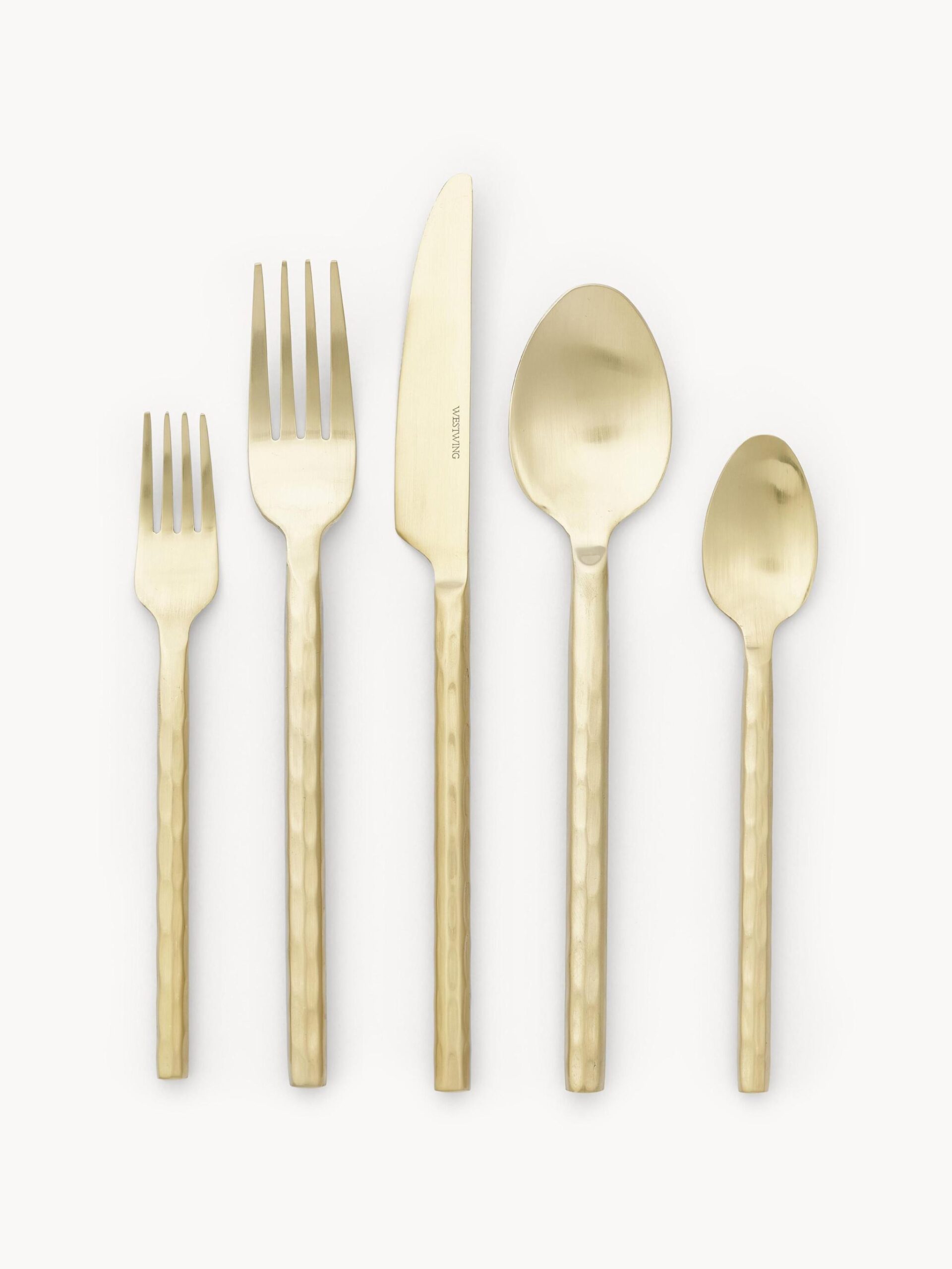 Dieses 20-teilige goldfarbenes Besteck-Set mit Griffen in stillvoller Hammerschlag-Optik besteht aus je vier Tafelgabeln, Tafelmessern, Taffellöffeln, Kuchengabel und Teelöffeln.